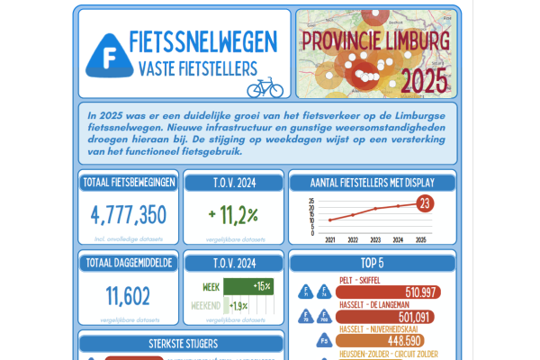Benieuwd naar de resultaten van de fietstellers van provincie Limburg? Bekijk hier de infografiek van de fietstellingen van 2025.
