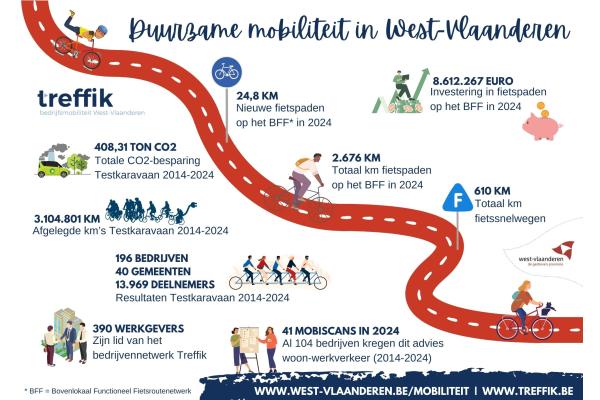 Deze infografiek geeft op een beknopte en bevattelijke manier de resultaten weer van het provinciaal mobiliteitsbeleid (editie 2025, data van het jaar 2024). Zie editie 2023 met data van 2022 hier.