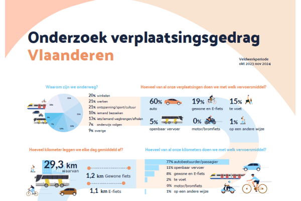 De resultaten van de recente bevragingen over het verplaatsings- en mobiliteitsgedrag in Vlaanderen, handig samengevat in infographics voor de meetperioden 2023-2024. Meer info vind je hier.