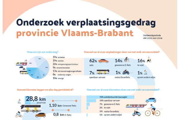 De resultaten van de recente bevragingen over het verplaatsings- en mobiliteitsgedrag in Vlaams-Brabant, handig samengevat in infographics voor de meetperioden 2015-2019 en 2021-2022.